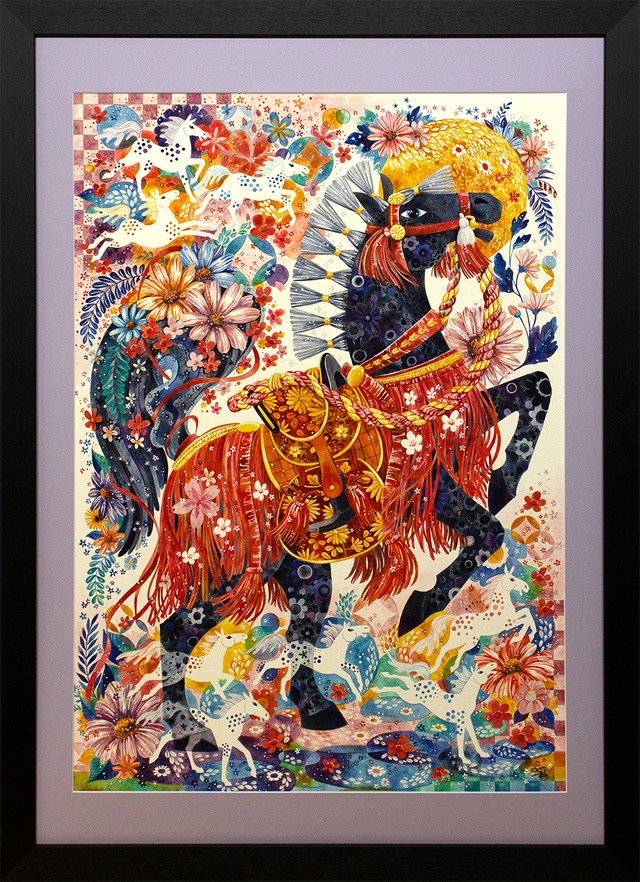 「世界に一点、あなただけの守護馬を。」 画家 illustrator asaが透明水彩で描き上げた、2026年の干支「九頭馬」の原画作品です。 透明水彩ならではの瑞々しい色彩、紙の質感に宿る色の深み、そして一点物だけが放つ圧倒的なエネルギーを直接感じていただけます。 本作では、一筆の中に複数の色が複雑に溶け合う『分離色(Granulating colors)』を贅沢に使用しています。 水彩ならではの自然な色の分離が生み出す、深みのある幻想的な階調は、原画一点物のみが持つ唯一無二の表情です。 【管理・品質】 当デザイン事務所が責任を持って管理・額装を監修いたしました。 作品の保存性を高める額装にてお届けします。 【仕様】 ・技法:透明水彩分離色(Granulating Watercolor on Paper) ・作品サイズ:B2(728mm × 515mm) ・額装サイズ:A1サイズ(マット仕立て) 【展示・納品情報】 本作品は現在弊社「木屋町のはりビル」にて展示中です。 実物をご覧いただけます。(要予約) 会期中のため、発送は展示終了後となります。 【法人様・個人のコレクター様へ】 当事務所名義での領収書発行が可能です。 実物の確認や、設置場所への額装コーディネートのご相談も承っております。 お気軽に[メッセージ]よりお問い合わせください。