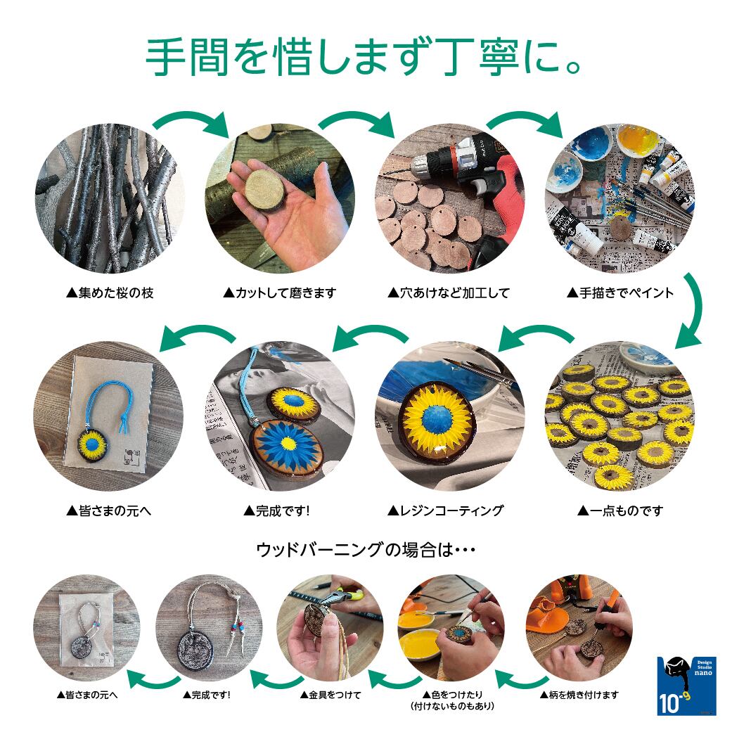 ●材質:桜の枝(廃材)・フェイクレザー紐・レジン(太陽の雫)・ホワイトハーツビーズ・他金具など